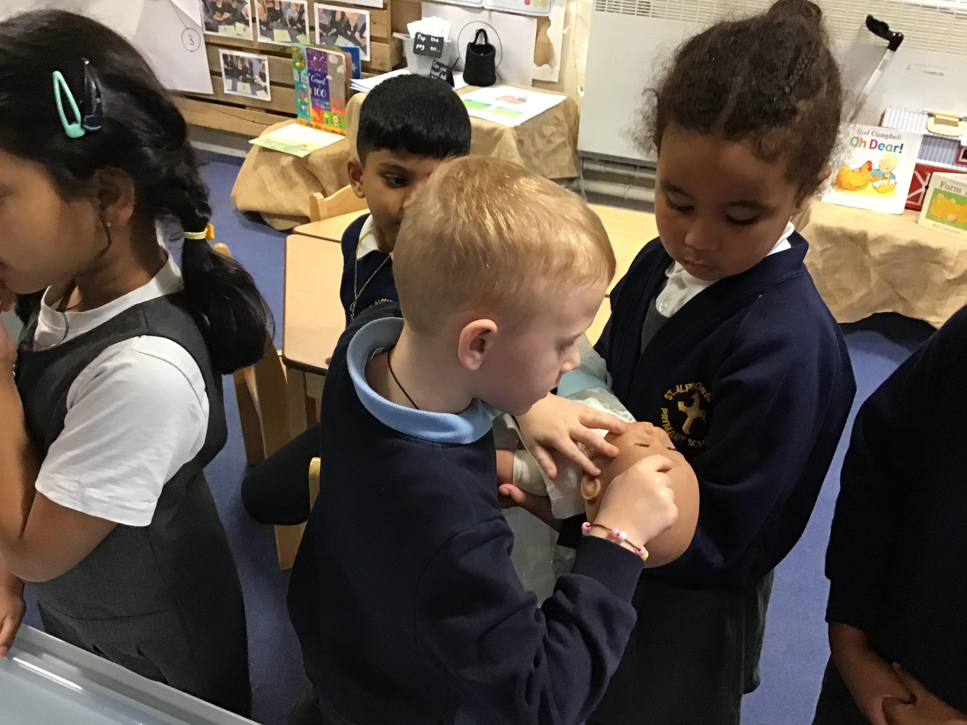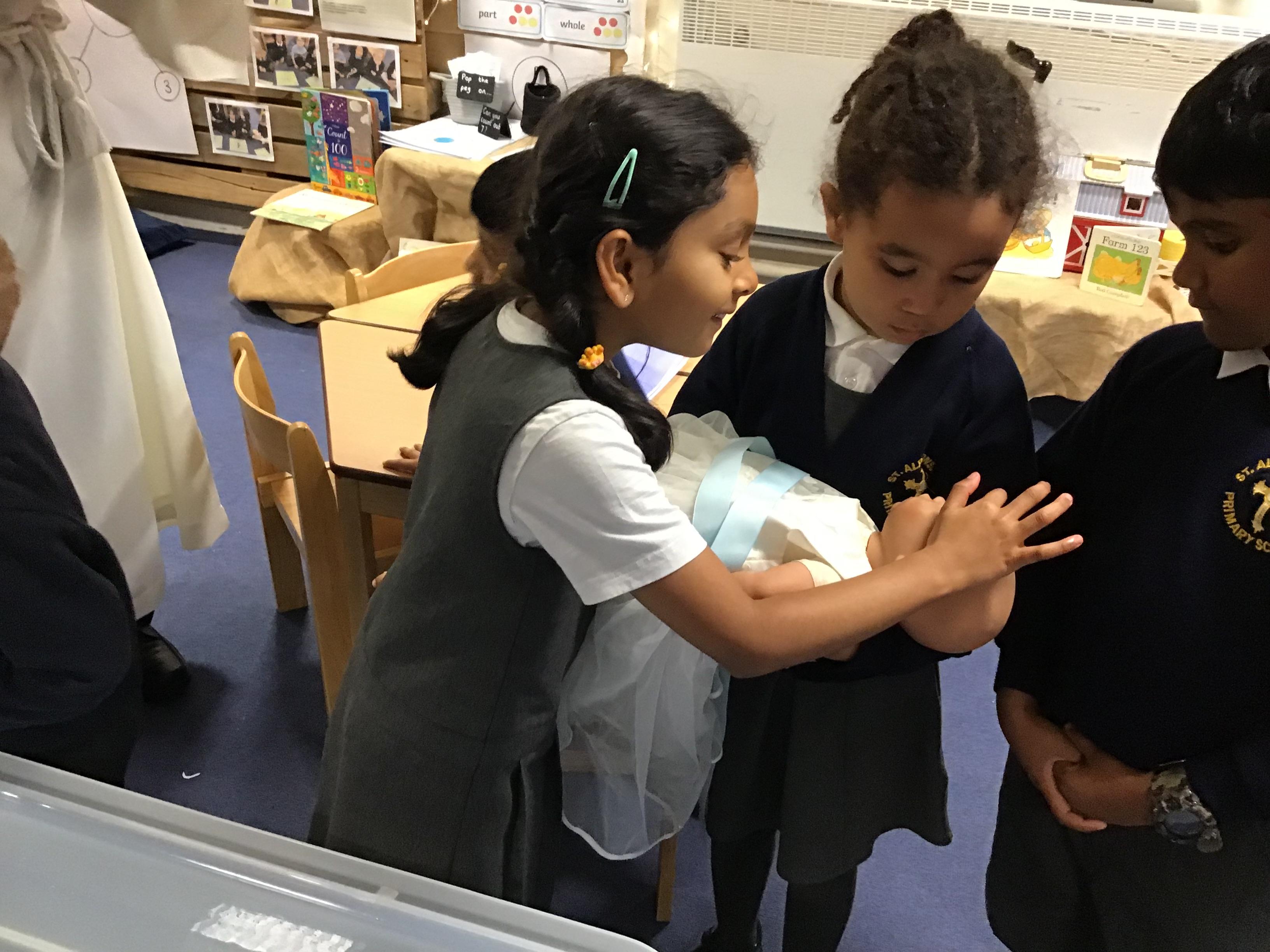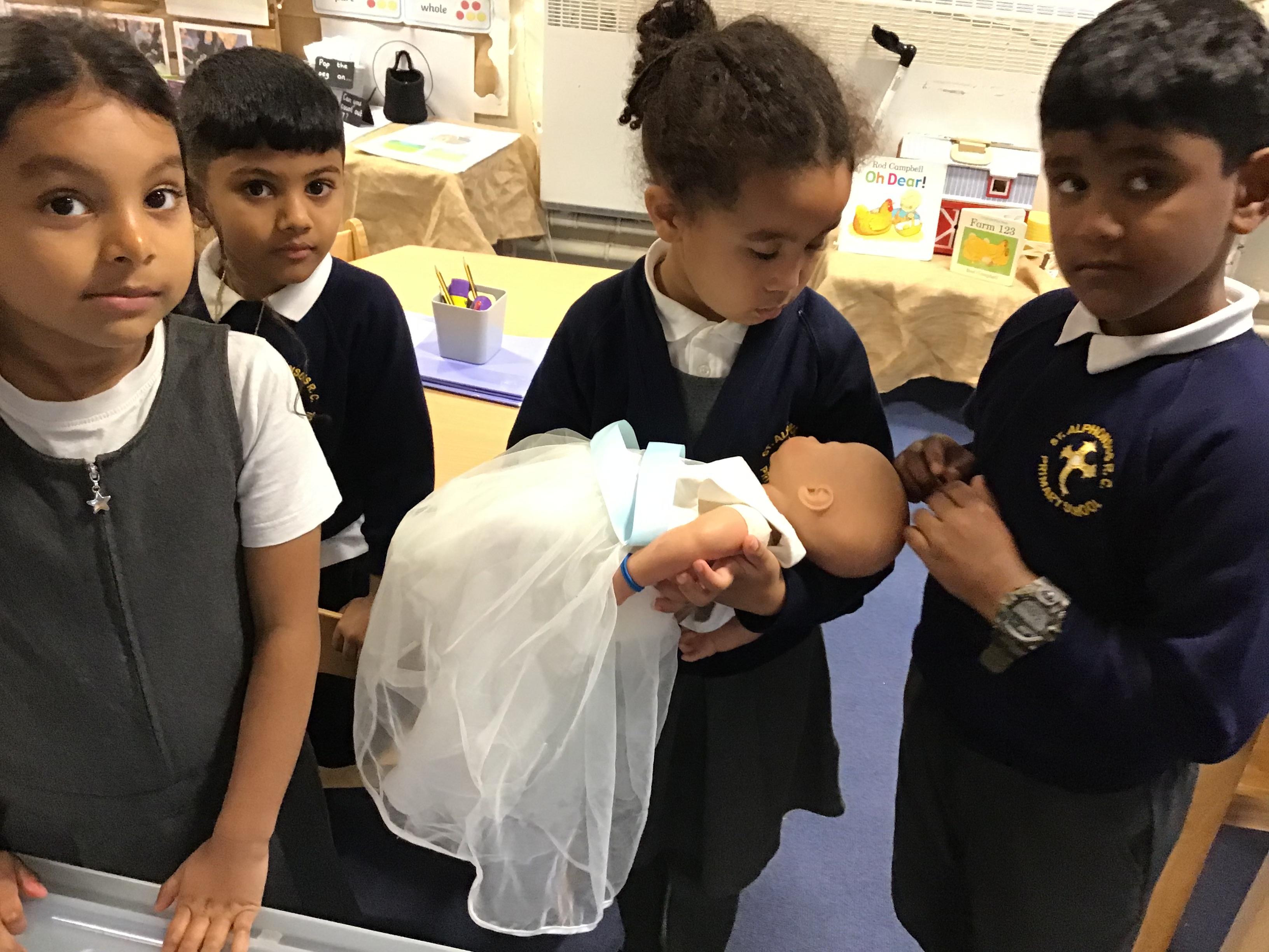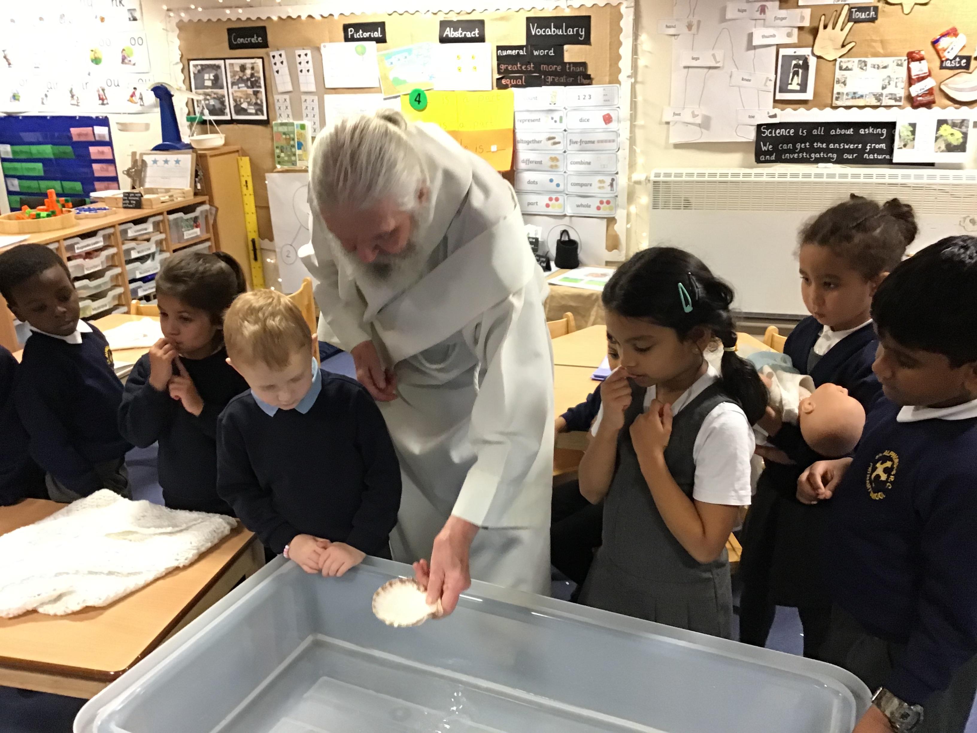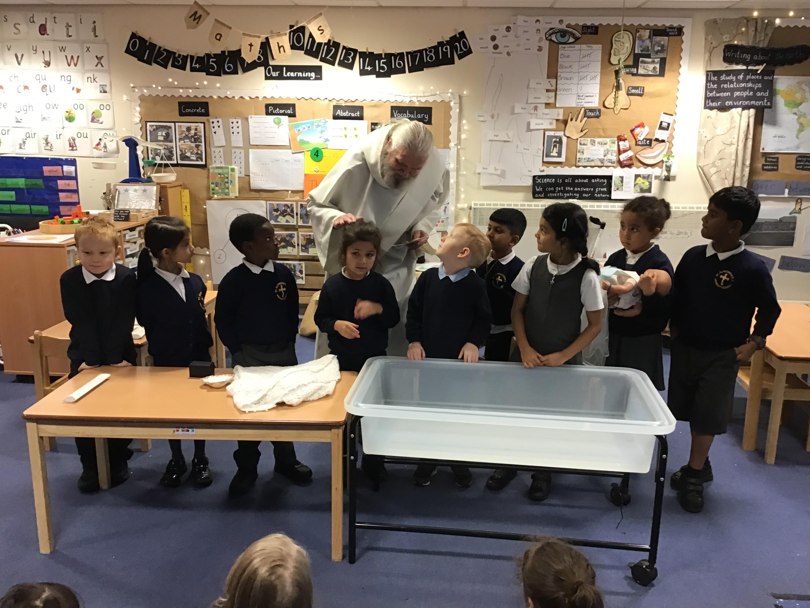 Autumn II Week Three This week we were blessed with a visit from Deacon Pat. Before he arrived, we chose children to be parents, Godparents and Grandparents, in preparation for a Baptism. During his stay, we found out more about the symbols used and the words spoken by the priest and family members when this sacrament is celebrated. He finished the visit by giving us all a special blessing.