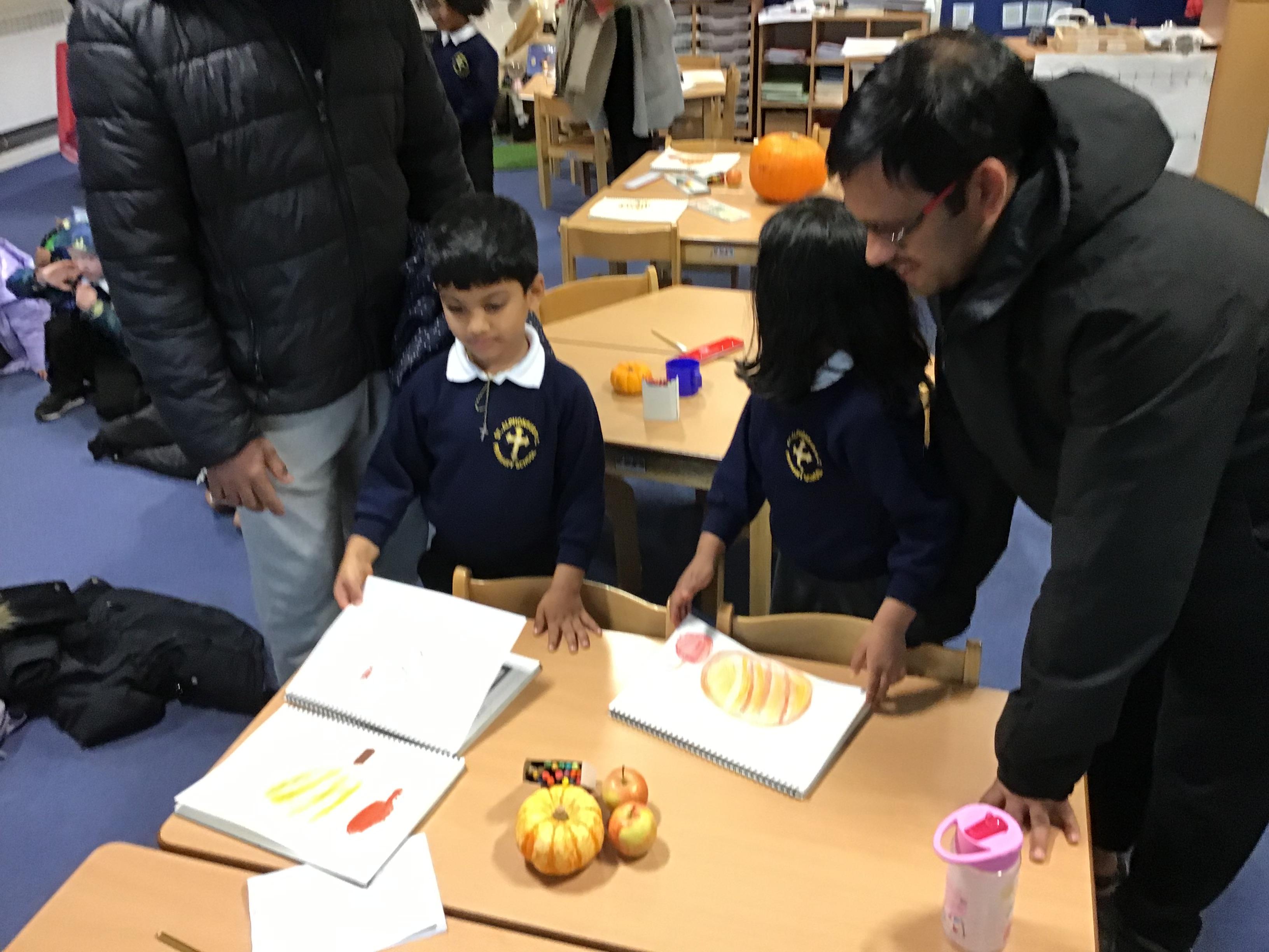 Week Eight - Pumpkin fever... During week eight, the pumpkins arrived in Year One! We enjoyed sharing the story, 'Granny Put a Pumpkin on Her Noggin' and acted it out. We used pumpkin coloured pomp poms to help solve our number sentences. Also, our parents popped in to see our art work. We used oil pastels to create our own pumpkins. Year One demonstrated such wonderful blending of colours.