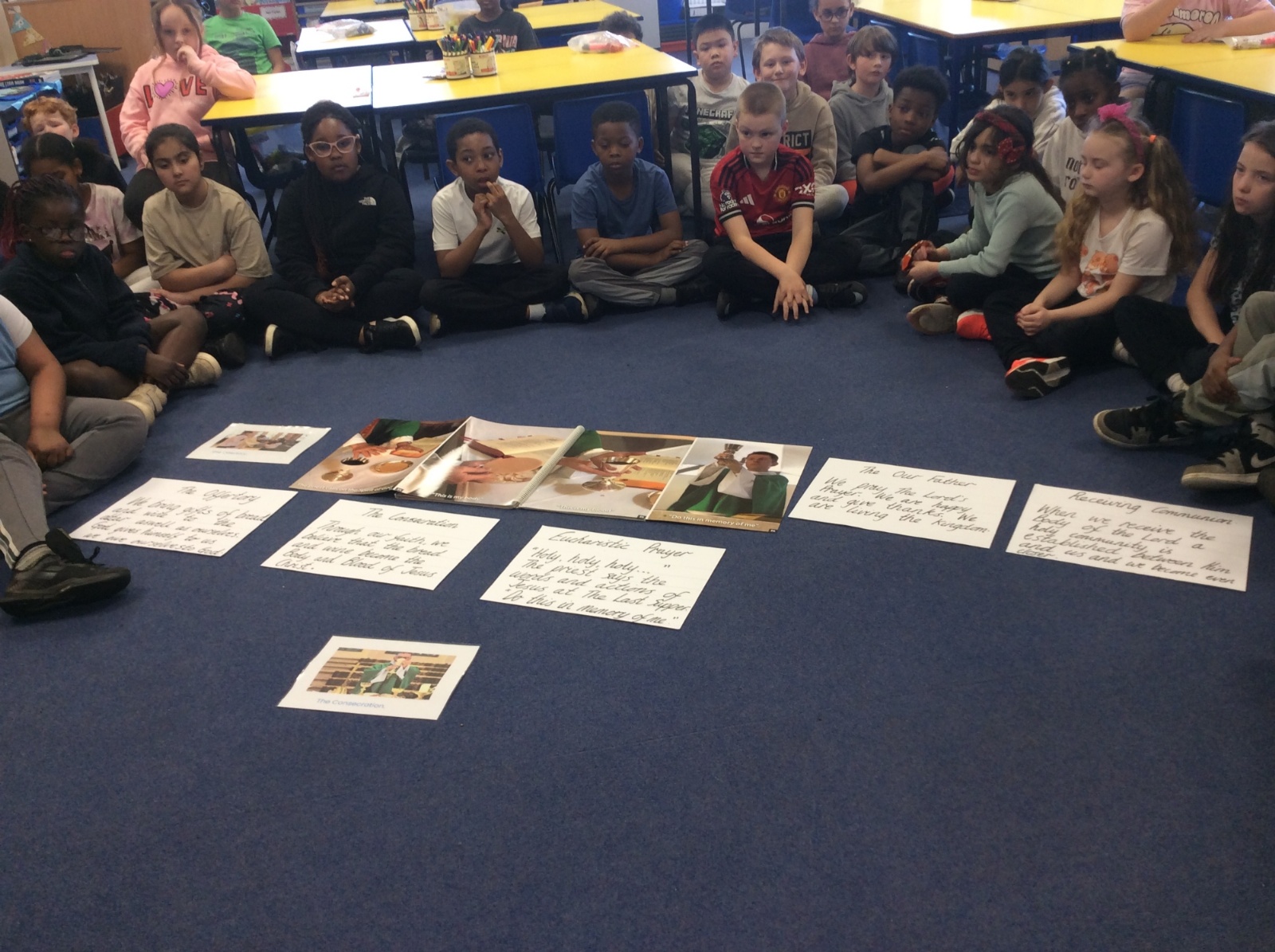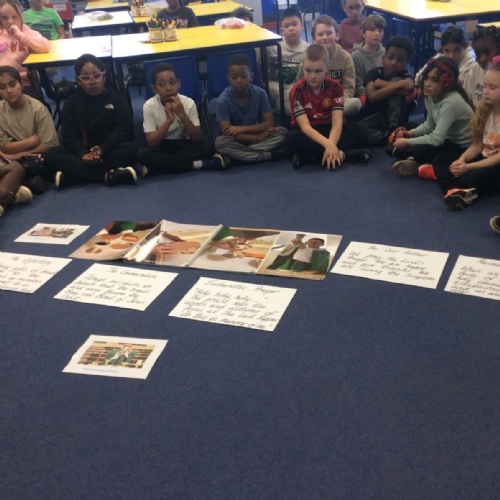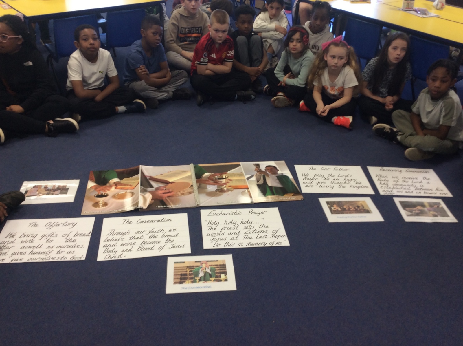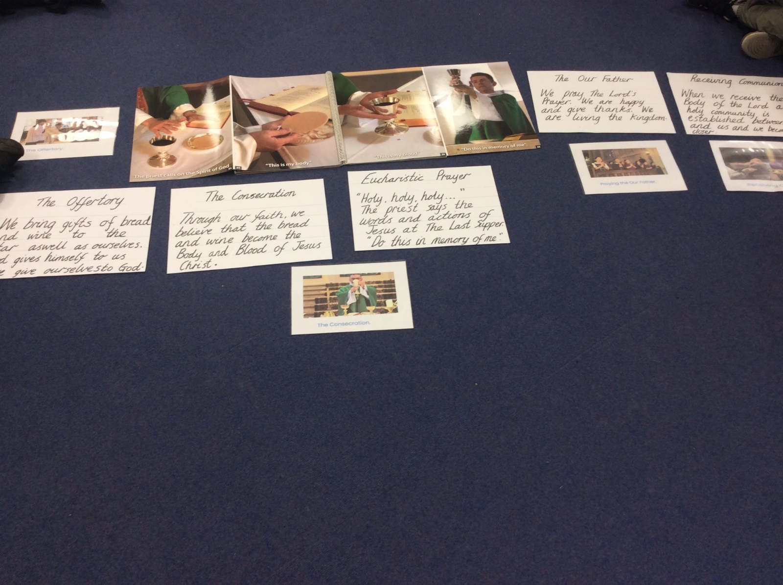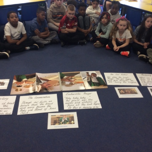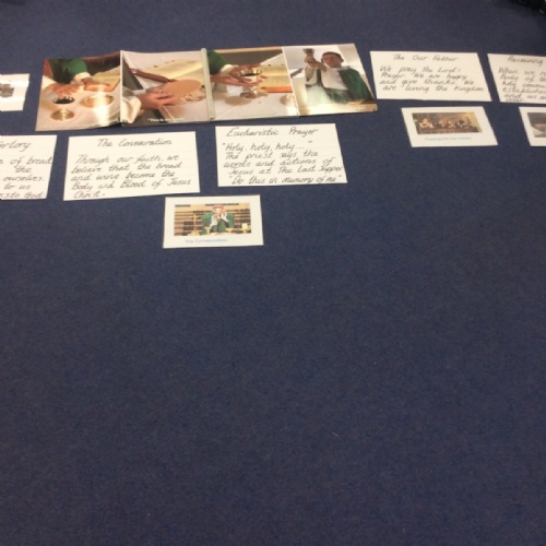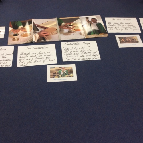 Year 3 and 4 worked together to link the words and actions of The Feeding of the 5000, The Last Supper and The Liturgy of the Eucharist. They looked at the four point structure of the Mass and focused on the words and actions during The Liturgy of the Eucharist. They sequenced the events and recorded a synopsis of what happens at each point during this part of the Mass.