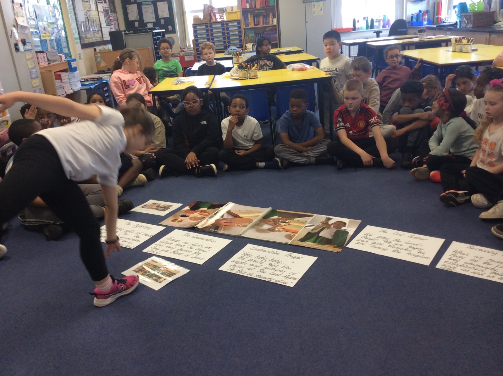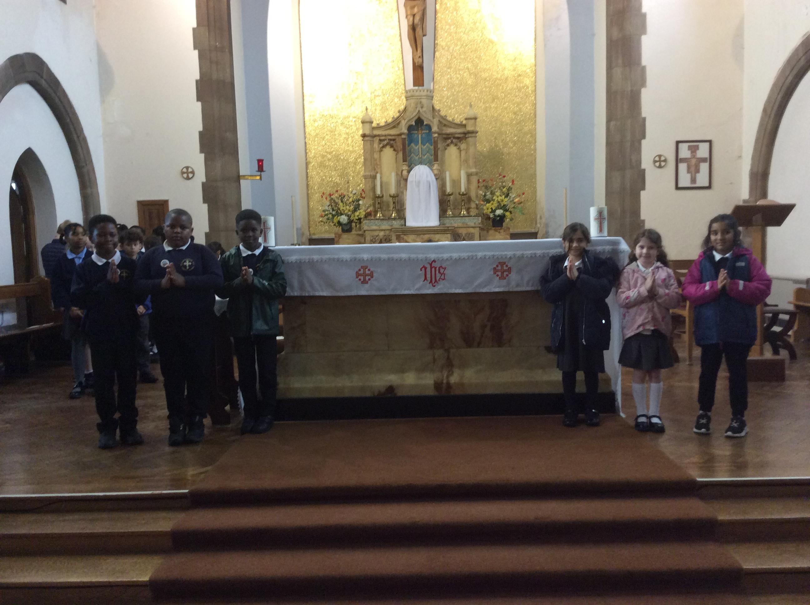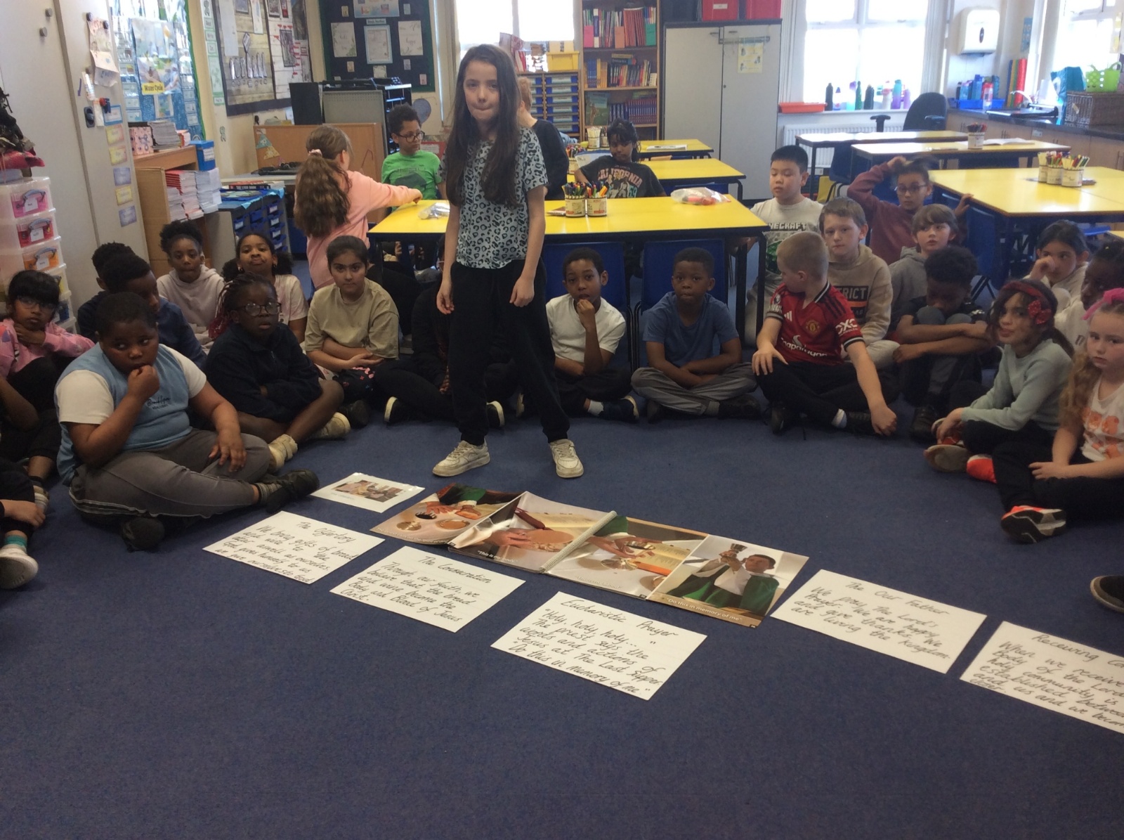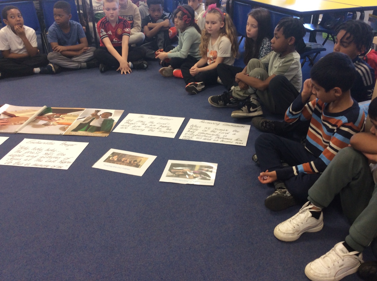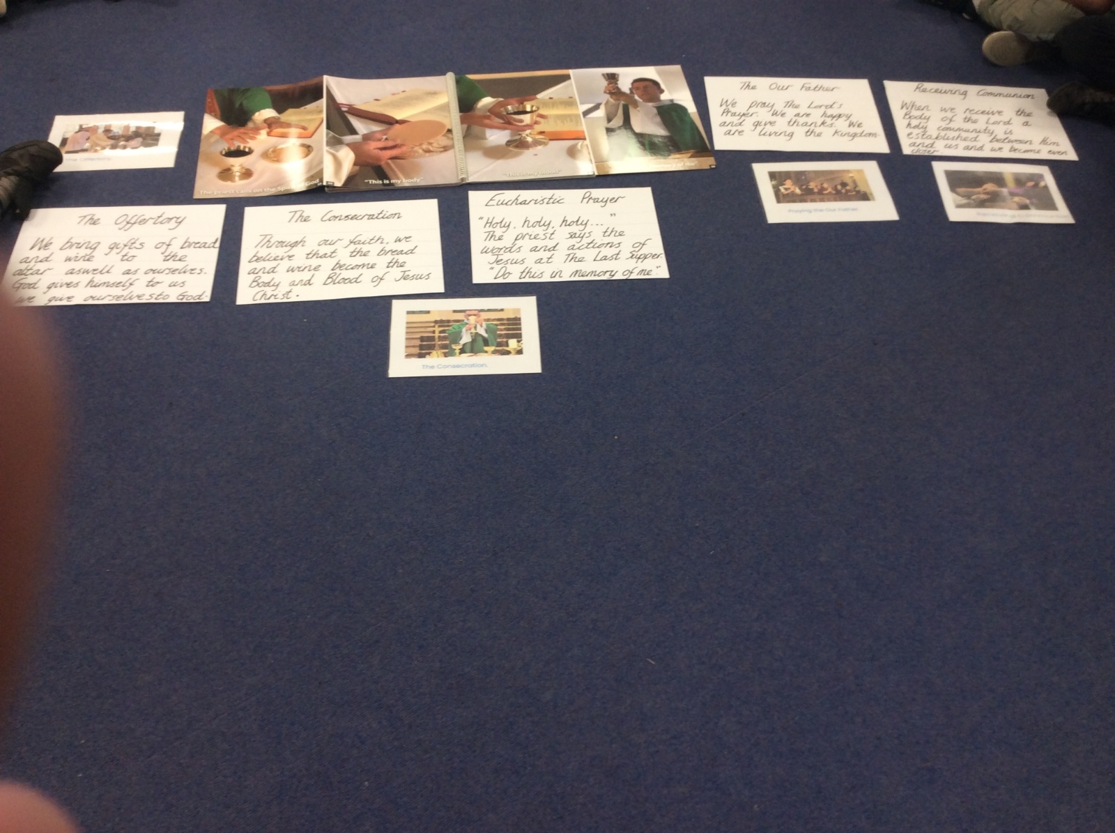 Year 3 and 4 worked together to link the words and actions of The Feeding of the 5000, The Last Supper and The Liturgy of the Eucharist. They looked at the four point structure of the Mass and focused on the words and actions during The Liturgy of the Eucharist. They sequenced the events and recorded a synopsis of what happens at each point during this part of the Mass.