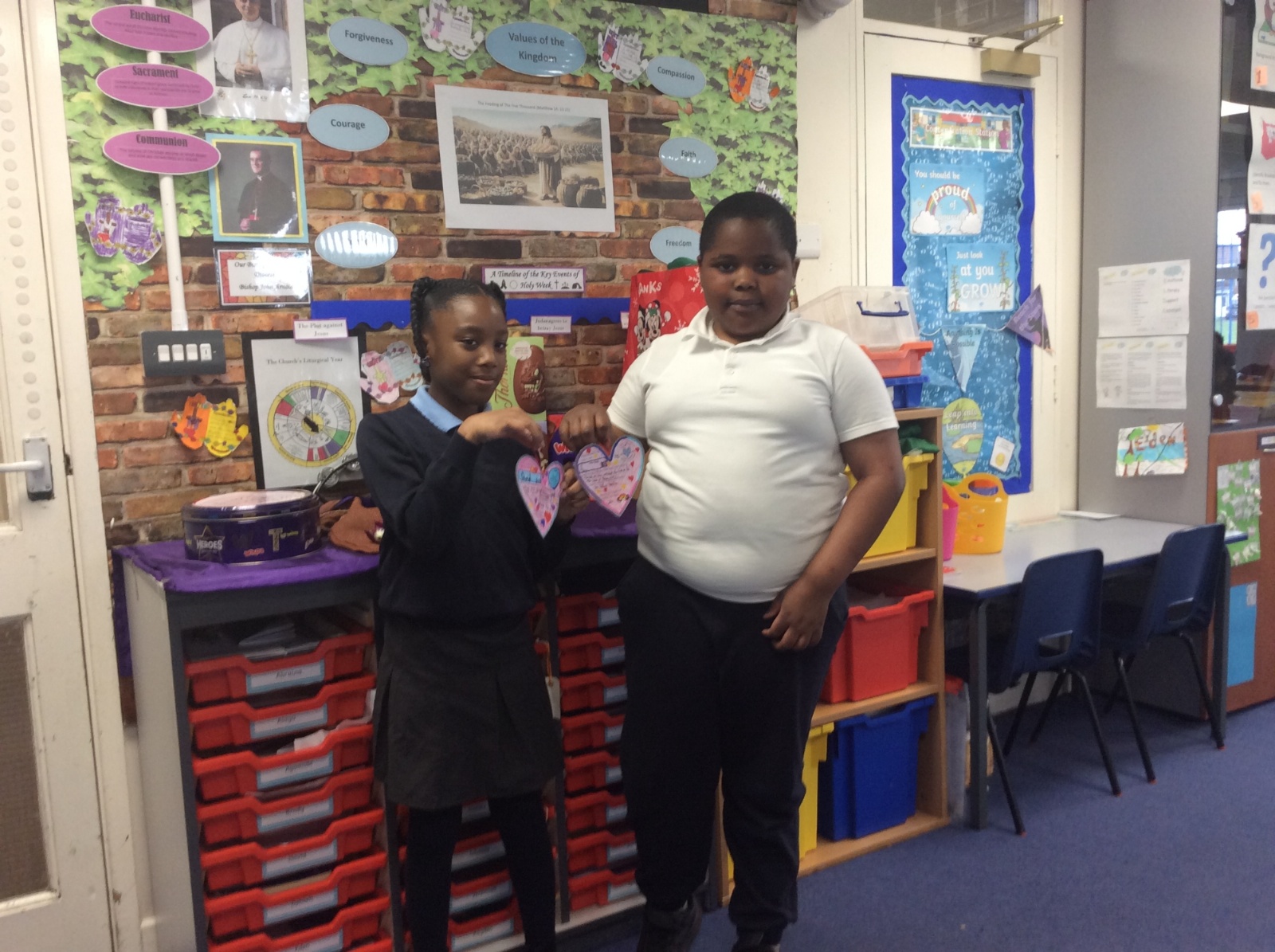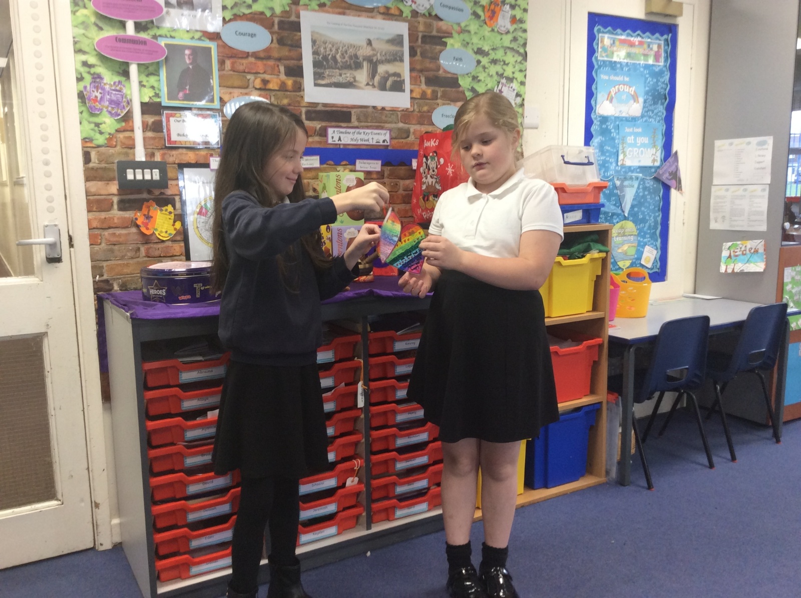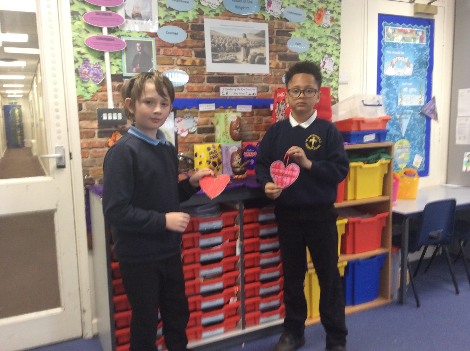 The heart symbolises love, care and reaching out to others. Giving our hearts is about listening, helping and being kind. Everyone sat with a classmate and had a short conversation. After their chat, they filled in and decorated a heart to show what the other person had shared. They then presented the heart to the other person. Our actions today showed noticing, listening, sharing, including and loving others with all our hearts.